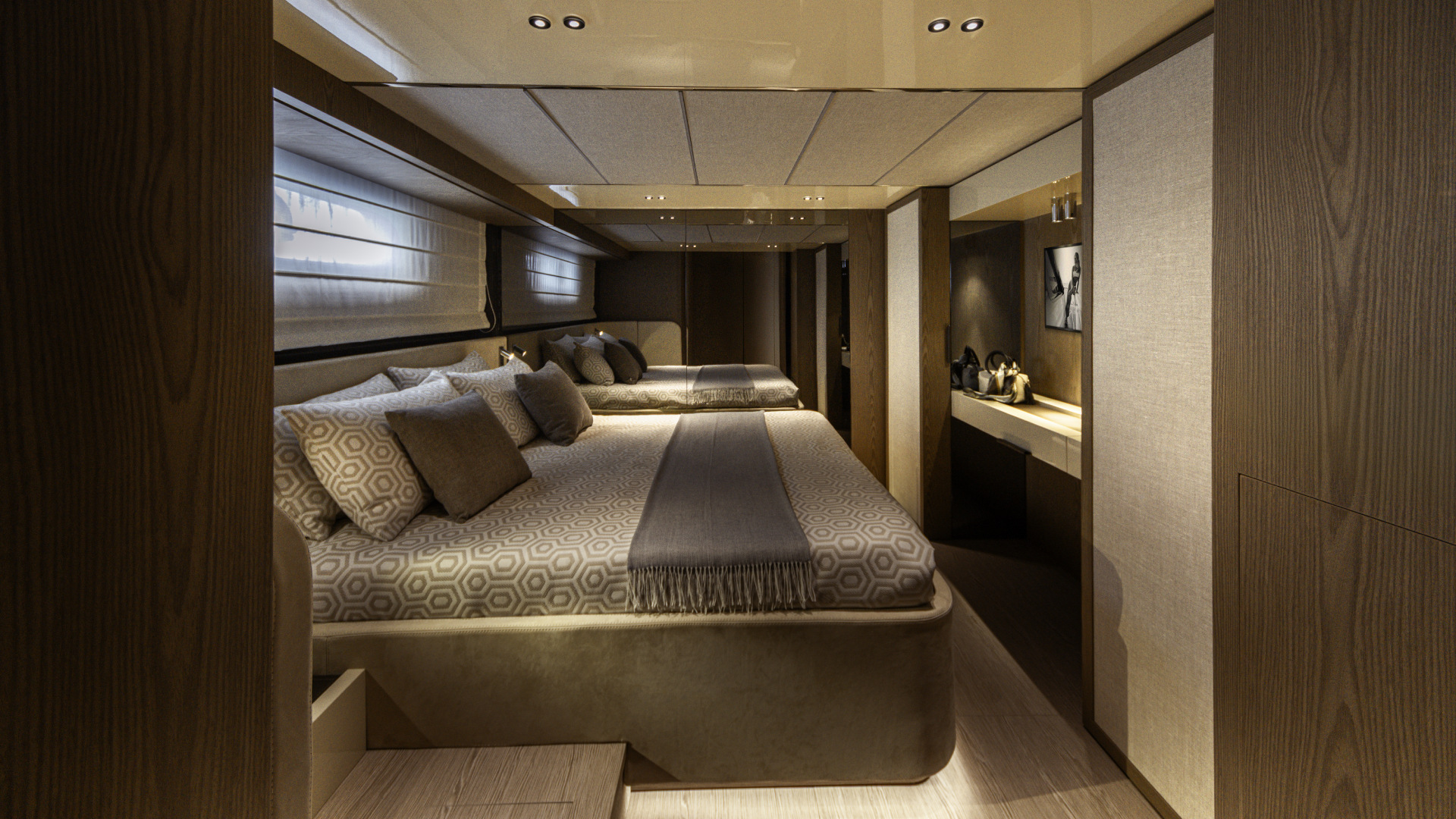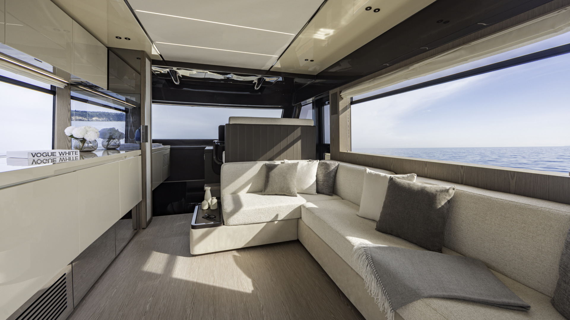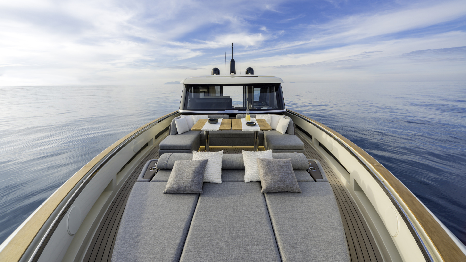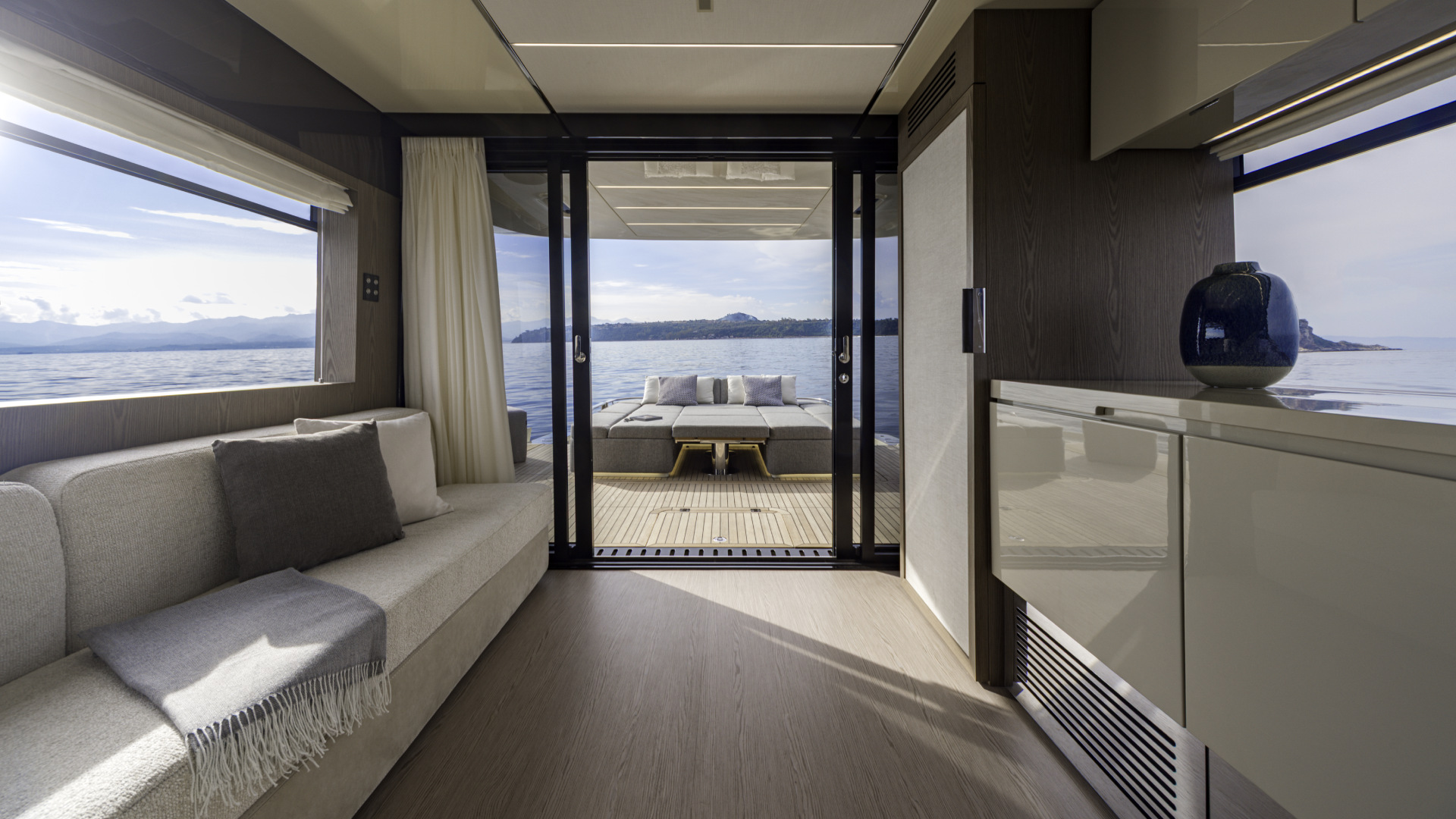 Il main deck è un volume aperto che dialoga con l’esterno. Le vetrate laterali scorrevoli, la porta a vetri di poppa e la ventilazione naturale data dal flap frontale creano una continuità visiva e sensoriale tra salone, timoneria e pozzetto. Ogni scelta, dalla porta laterale per il comandante alla cucina personalizzabile, rivela un approccio sartoriale alla progettazione, pensato per assecondare desideri e abitudini di chi vive davvero la barca.