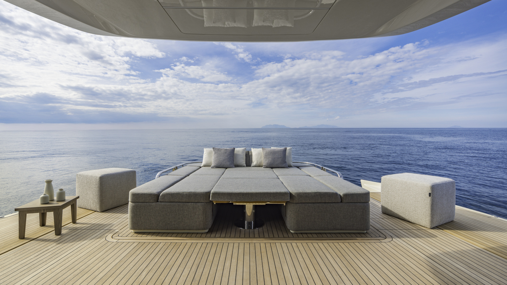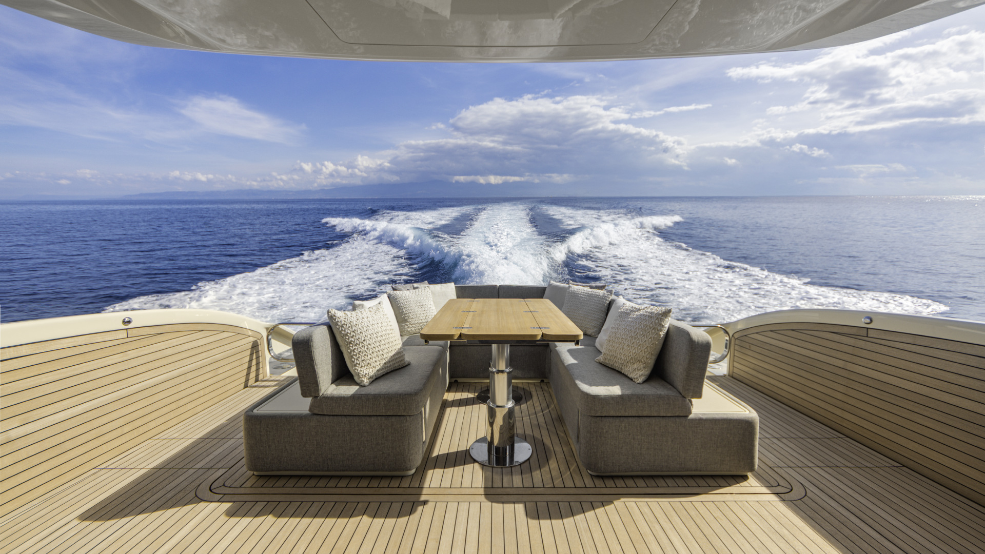 Anche il pozzetto uno spazio di raffinata versatilità con zona pranzo trasformabile in prendisole, cucina outdoor, murate abbattibili che ampliano la superficie e dissolvono ogni barriera tra barca e acqua. La passerella a filo, l’ampia plancetta abbassabile e il garage per jet tender da 2,8 metri con doppia apertura per un uso modulare sono soluzioni da yacht di categoria superiore, qui racchiuse in 16,87 metri di pura maestria.
