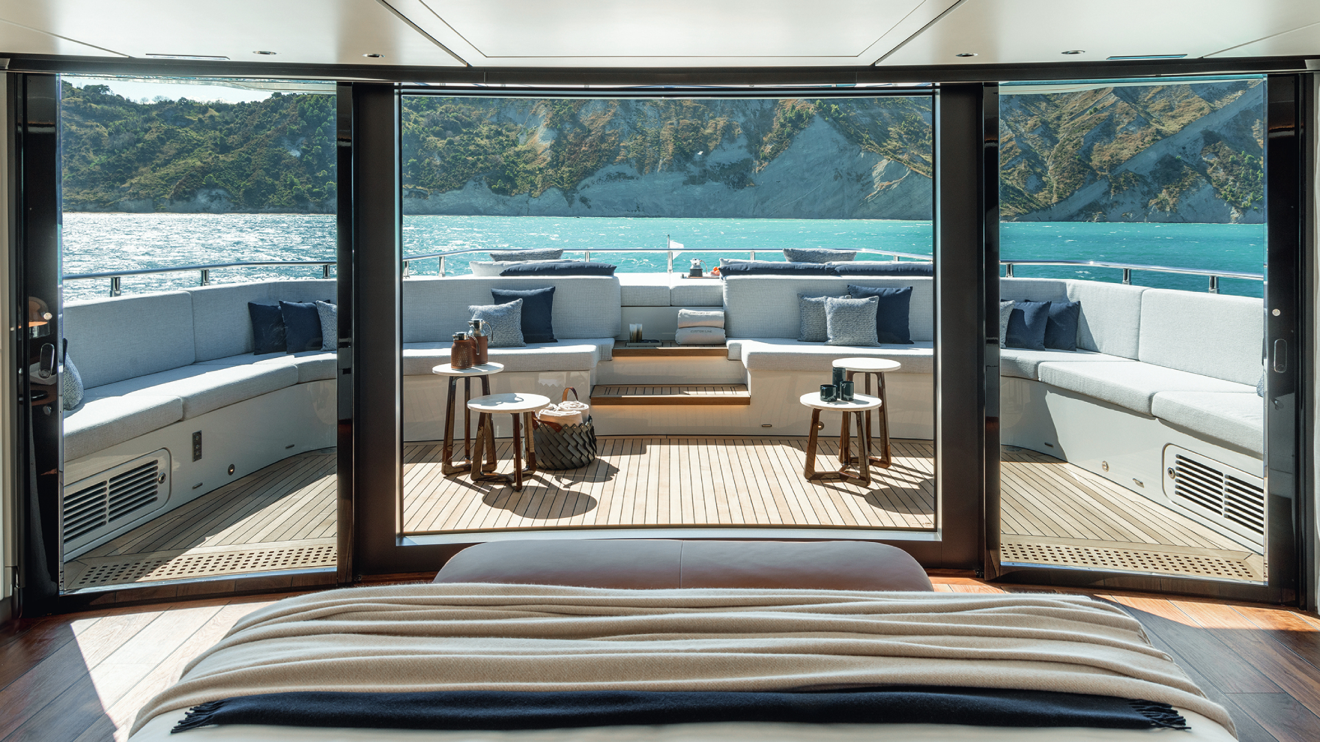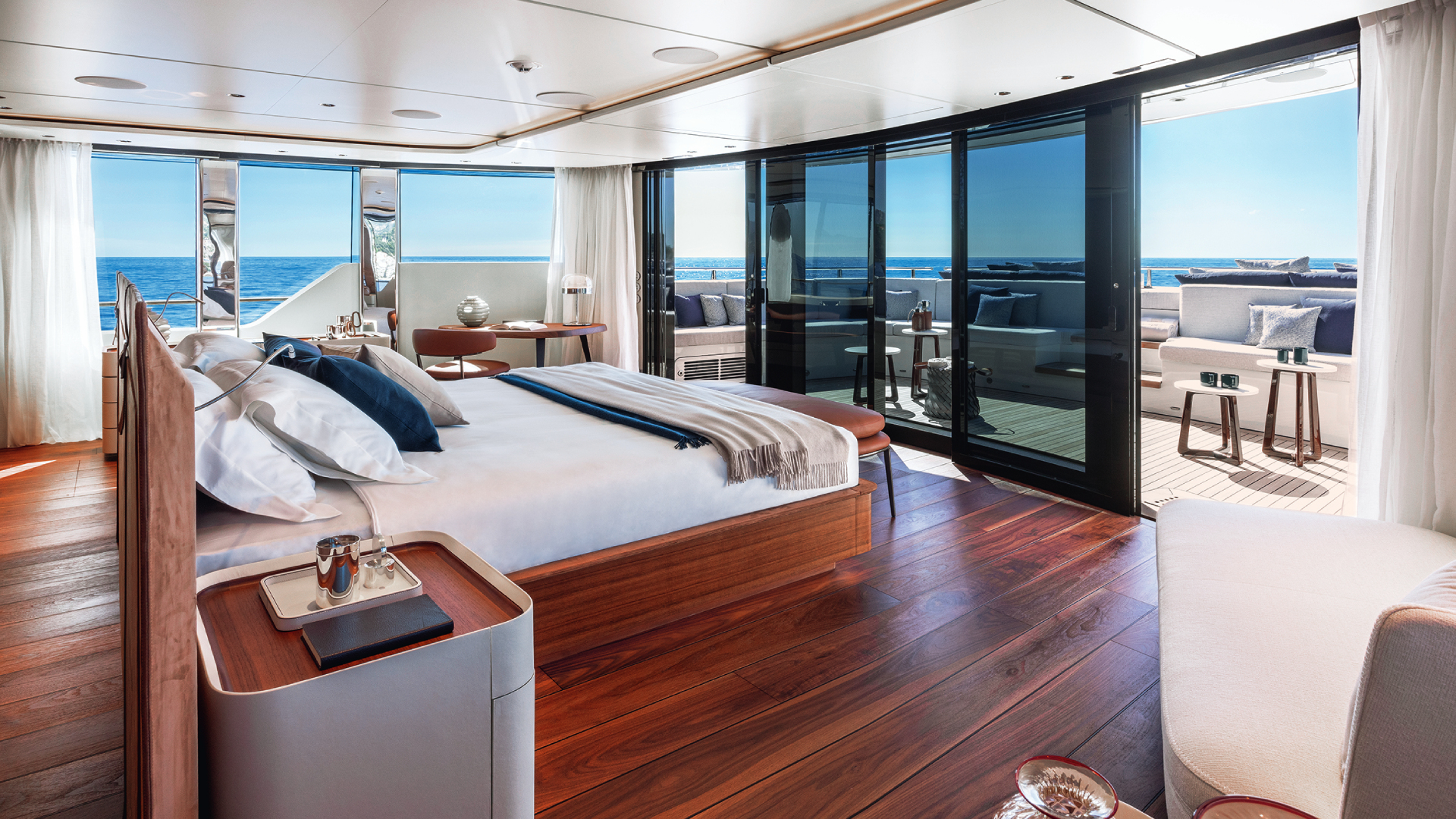 Ciò che distingue il Custom Line 50 è il layout, che introduce soluzioni innovative per questa fascia di mercato. Il ponte superiore è stato interamente dedicato all’armatore, offrendo uno spazio che raramente si trova su yacht di queste dimensioni. La suite armatoriale, con vetrate panoramiche a 180 gradi, è un autentico loft sul mare, completata da una terrazza privata a prua che garantisce privacy totale e connessione diretta con l’ambiente esterno. Lo spostamento della plancia di comando sul ponte principale ha reso possibile questa configurazione, consentendo all’armatore di godere della migliore vista a bordo. È una scelta ispirata a yacht di dimensioni maggiori, ora portata su un 50 metri, dimostrando come le esigenze degli armatori stiano evolvendo verso un maggiore focus sulla privacy e sull’esclusività degli spazi.