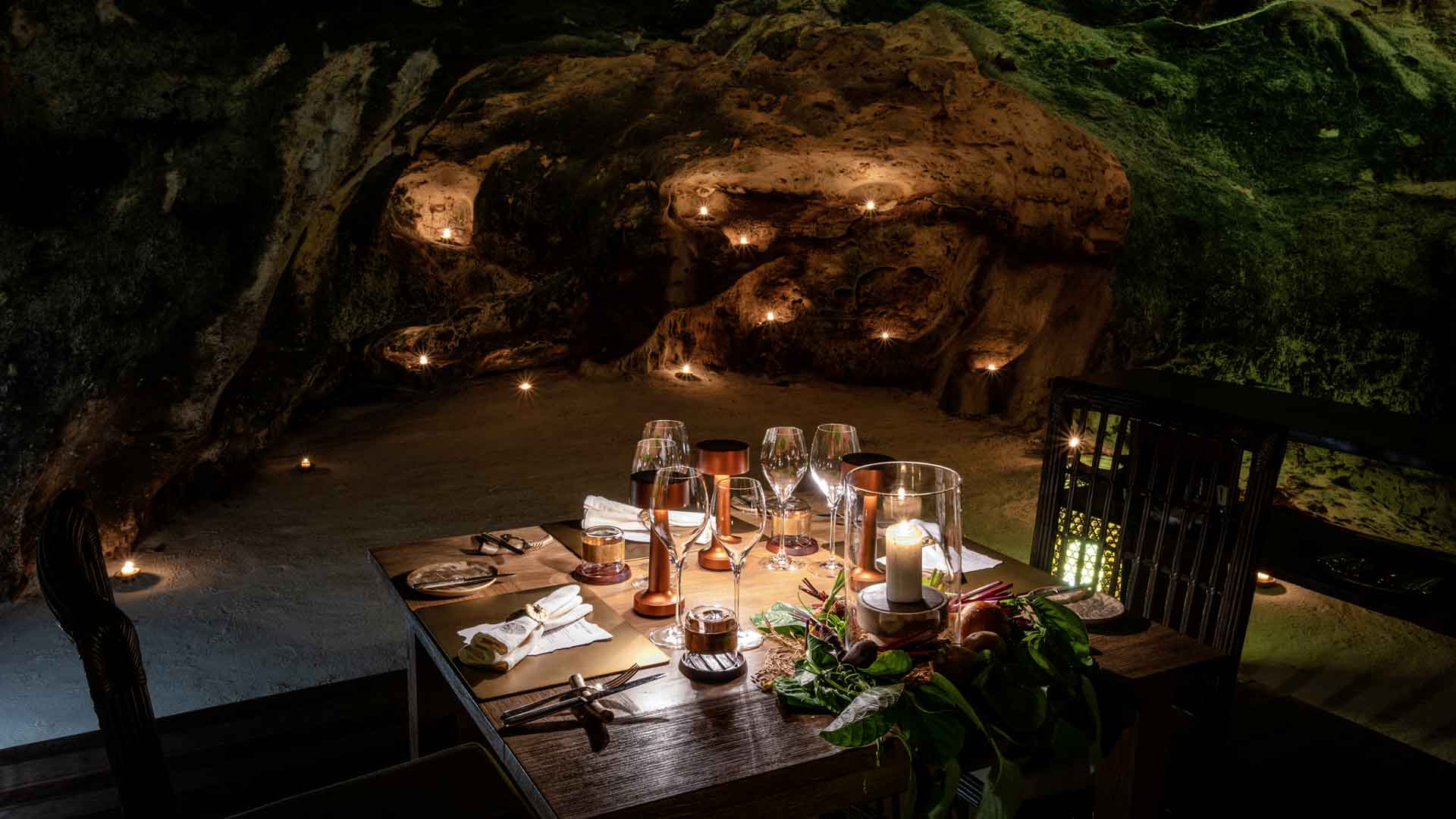 Per il pairing si può optare per un percorso enoico, oppure scegliere l’abbinamento con i cocktail come lo Swatimita, creato con pomelo indonesiano, bitter e soda al passion fruit e lychee. Chi vuole provare un’esperienza romantica, dovrà riservare la cena nella secret cave, una piccola grotta naturale allestita con un tavolo e una pioggia di candele, in cui viene servito uno speciale percorso degustazione.