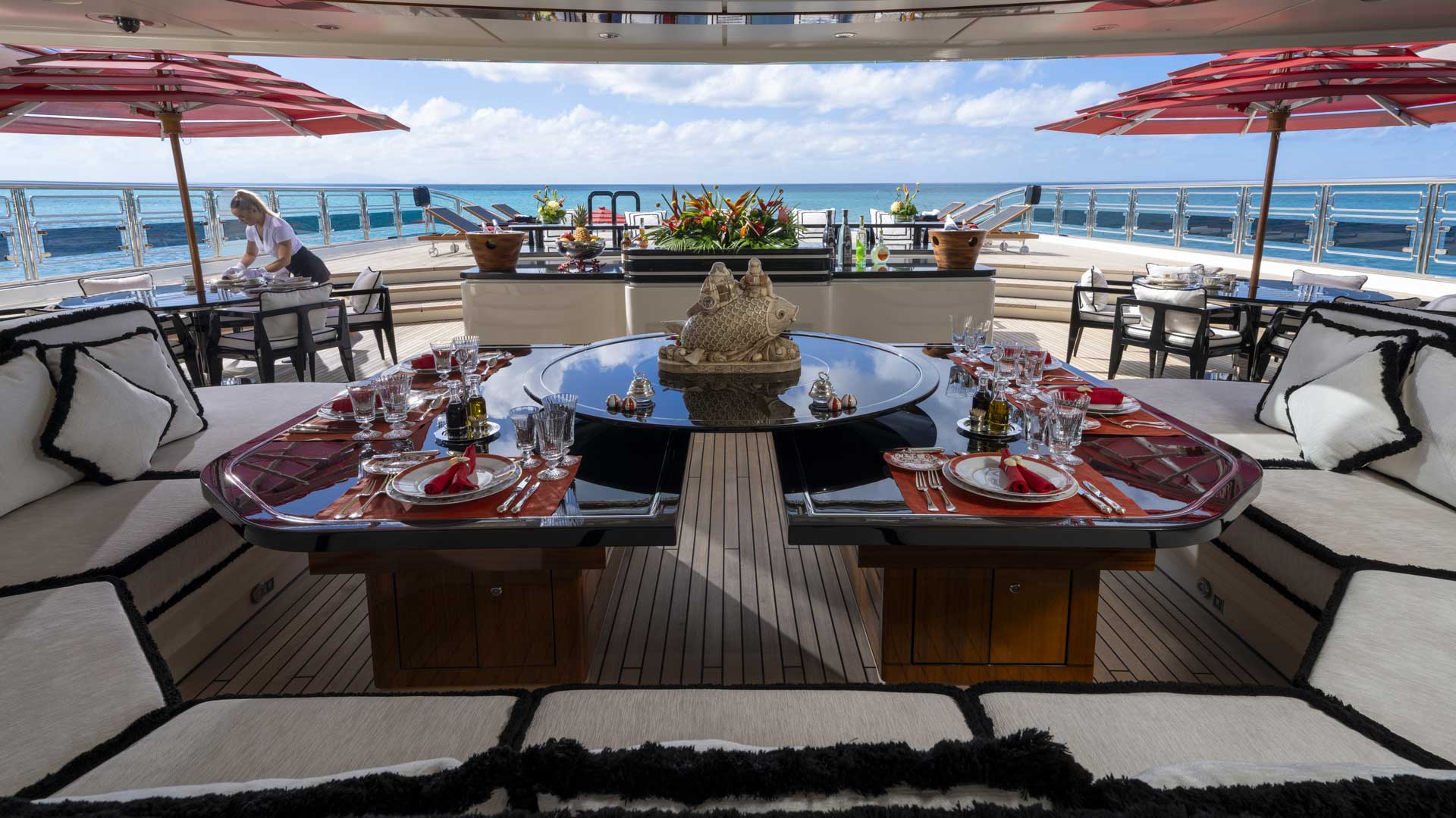 Celebre per la sua piscina a sfioro trasformabile in pista da ballo, Alfa Nero accoglie 12 ospiti in 6 cabine. Gli interni firmati Alberto Pinto combinano eleganza e carattere, con dettagli scenografici come il pianoforte a coda bicolore che domina il salone.