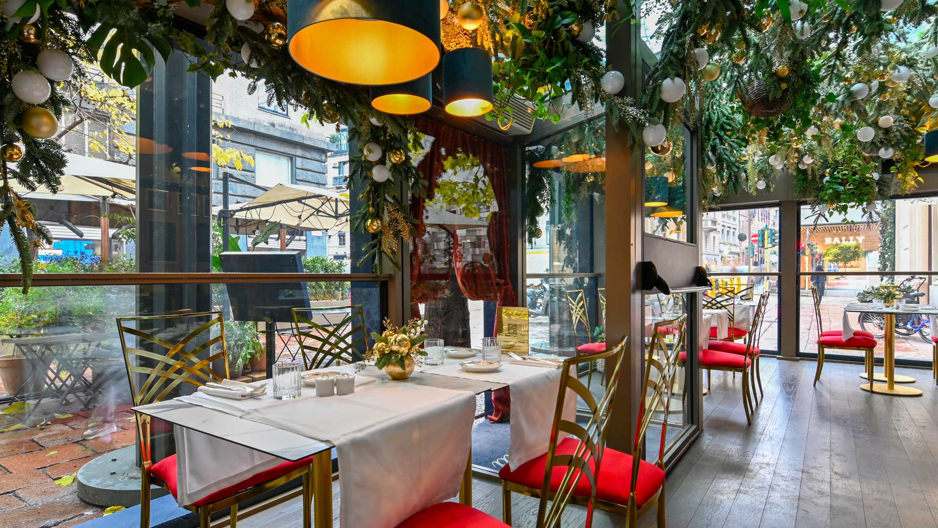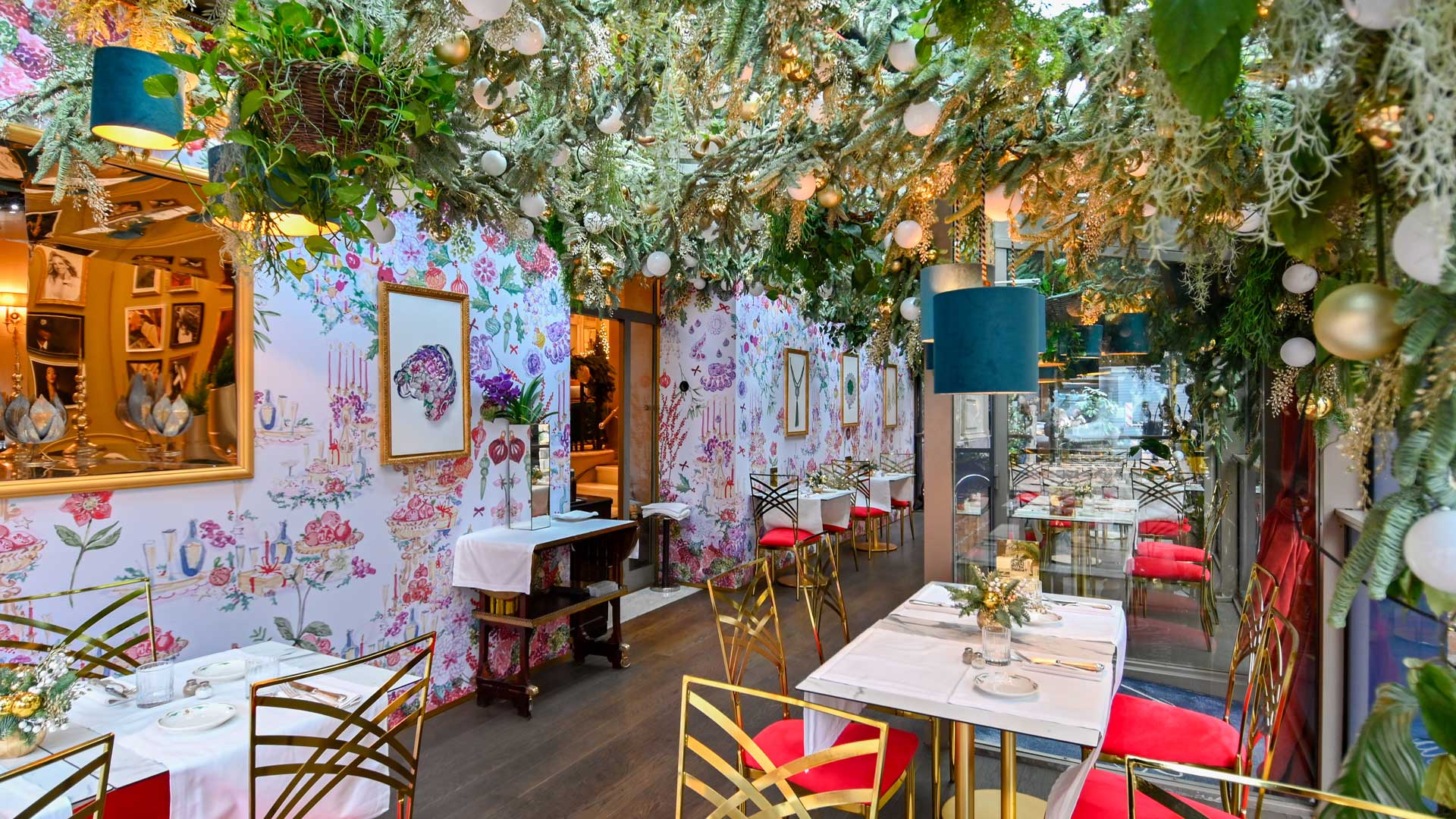 Per celebrare le feste e fino al 9 gennaio 2023, lo spazio incantato continuerà a fondere gli elementi più rappresentativi del brand con l’atmosfera da bistrot parigino. Il tutto, rivisitato in chiave meneghina e con diversi tocchi da sparkling Christmas. Come le sedie di colore rosso e oro che vanno a personalizzare i tavoli in veranda, oppure i centro tavola dorati. A fare da sfondo la carta da parati realizzata esclusivamente per la Maison da Susannah Garrod, famosa artista contemporanea.