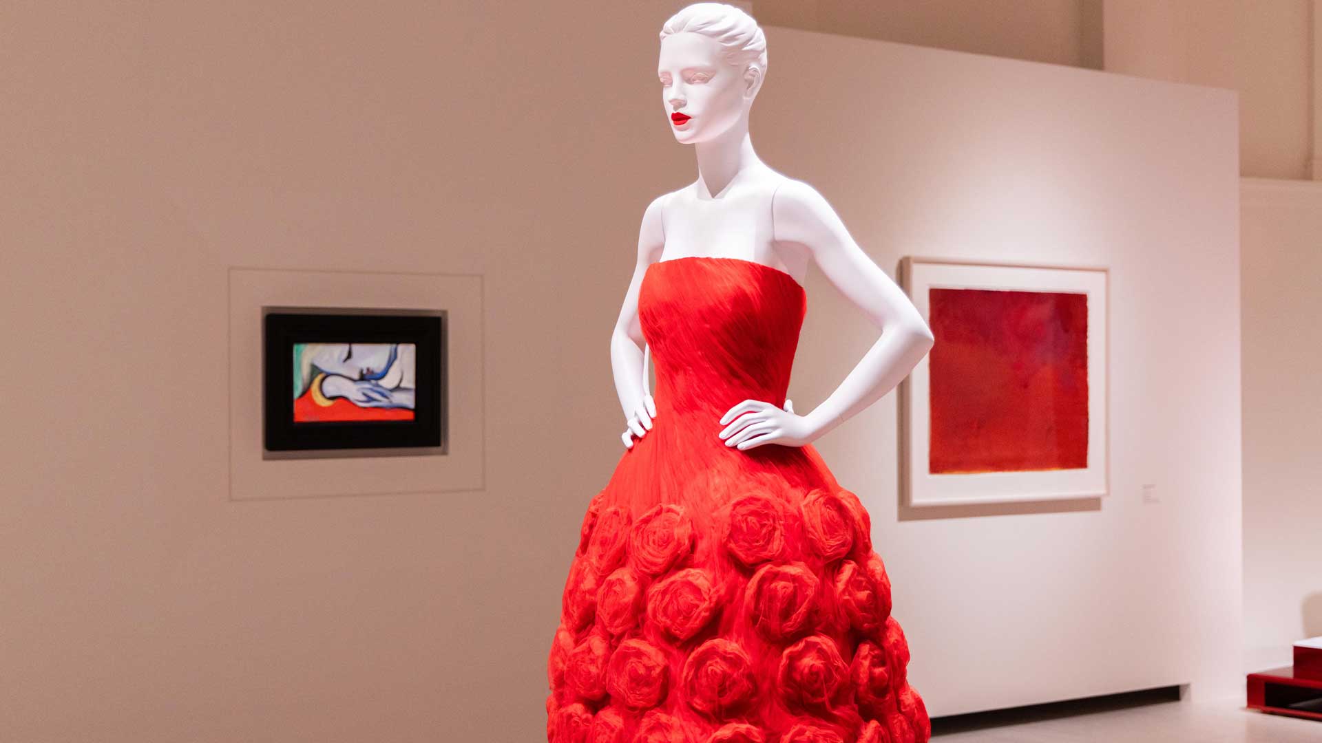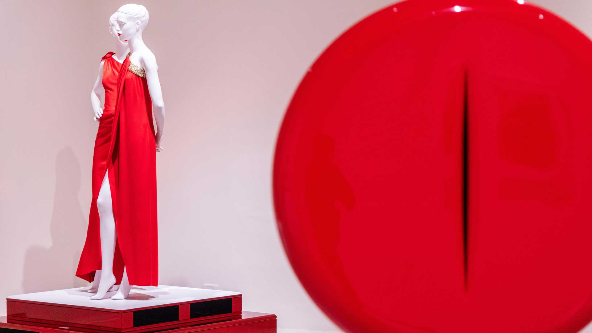 La costruzione curatoriale di Orizzonti | Rosso è pensata come un crescendo visivo e concettuale: il percorso si apre con una sezione introduttiva che indaga il rosso nella sua dimensione archetipica, colore del sangue, del potere, della seduzione, per poi articolarsi in nuclei tematici che intrecciano moda, pittura e scultura. Nei primi ambienti, le creazioni di Valentino dialogano con le tele monocrome di Fontana e le combustioni di Burri, in un confronto tra materia e tessuto, tra gesto artistico e taglio sartoriale. In altri spazi, la teatralità del rosso prende corpo nelle figure pop di Warhol e nei volti femminili di Picasso, evocando l’immaginario del desiderio e della metamorfosi.