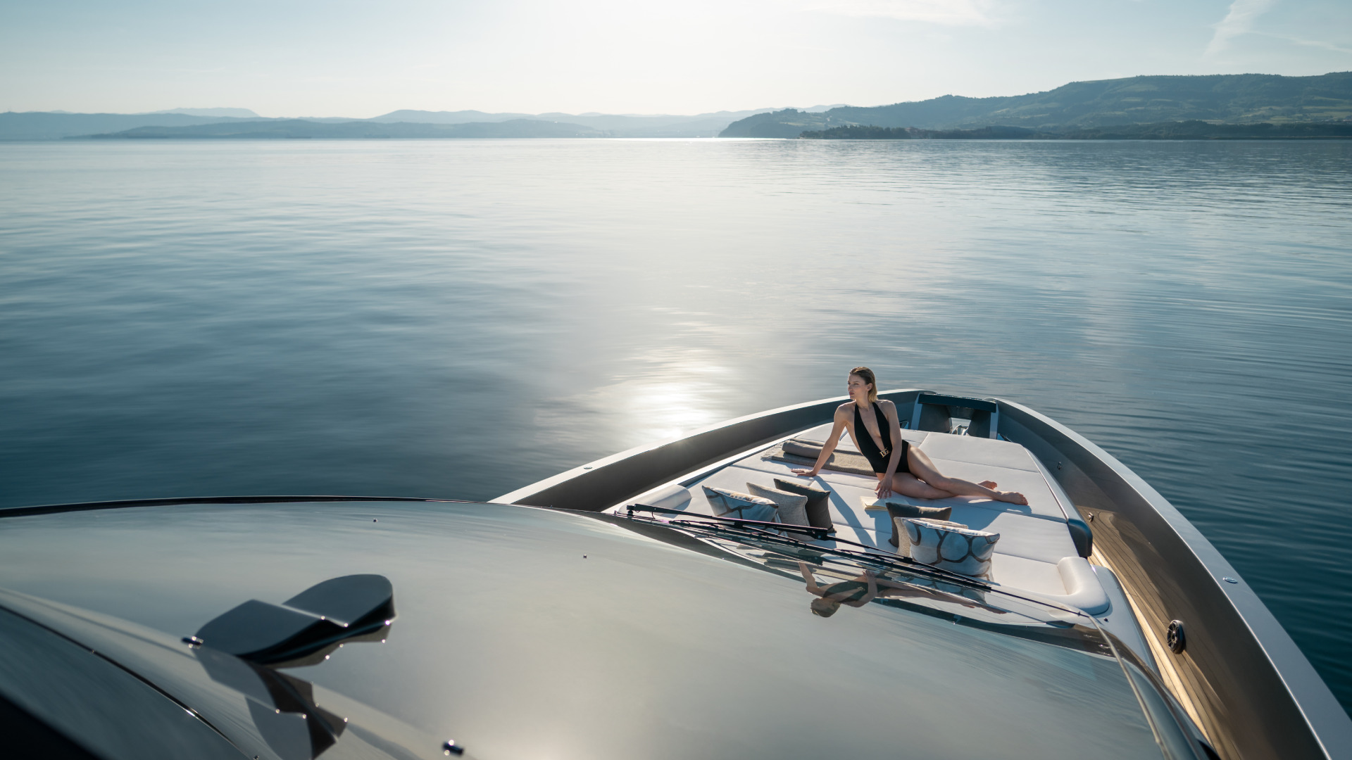 La sua architettura esalta il contatto diretto con il mare, grazie a spazi più ampi del 10–30% rispetto ad altri yacht della categoria. Il dinamico profilo esterno riprende i tratti tipici della gamma, combinando sportività e leggerezza. Sul main deck, l’area poppiera si sviluppa su due livelli: una beach area ampliabile fino a 23 metri quadri con terrazze apribili e plancetta “dual linear lift”, e un pozzetto conviviale ombreggiato dallo sportfly.