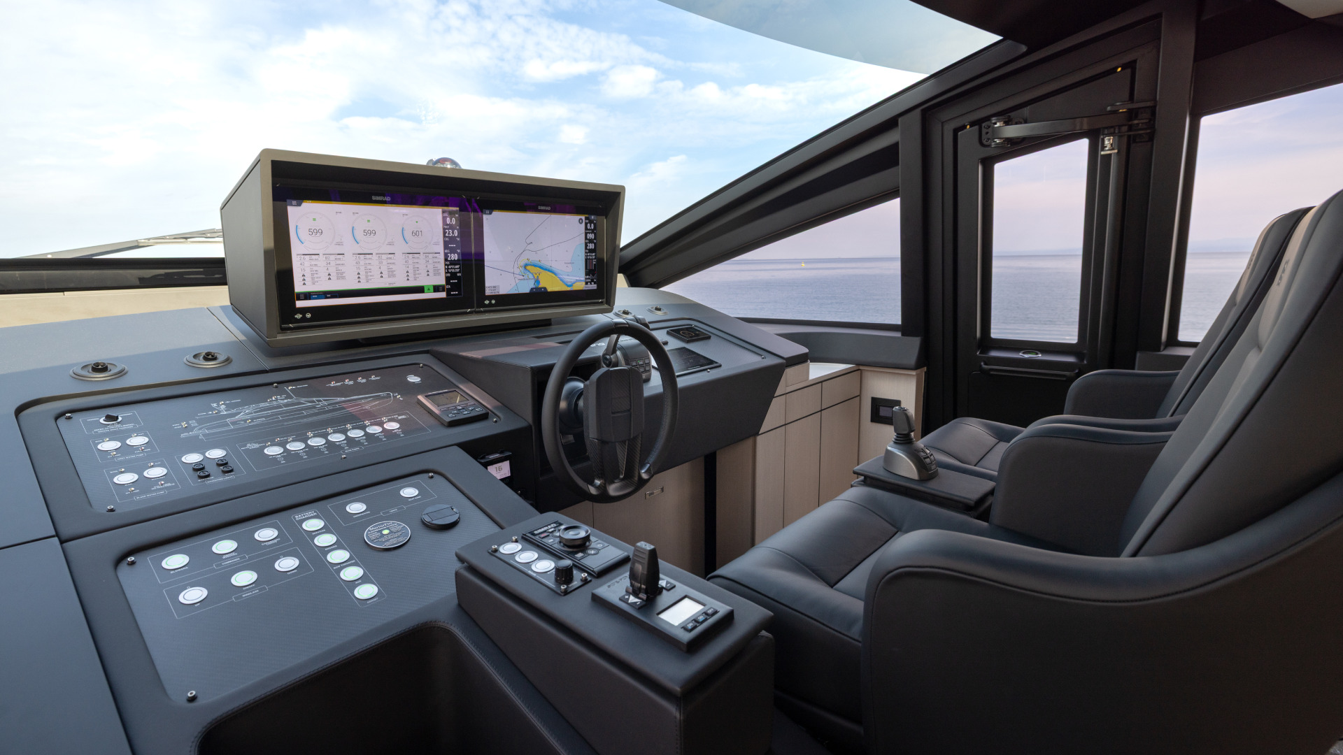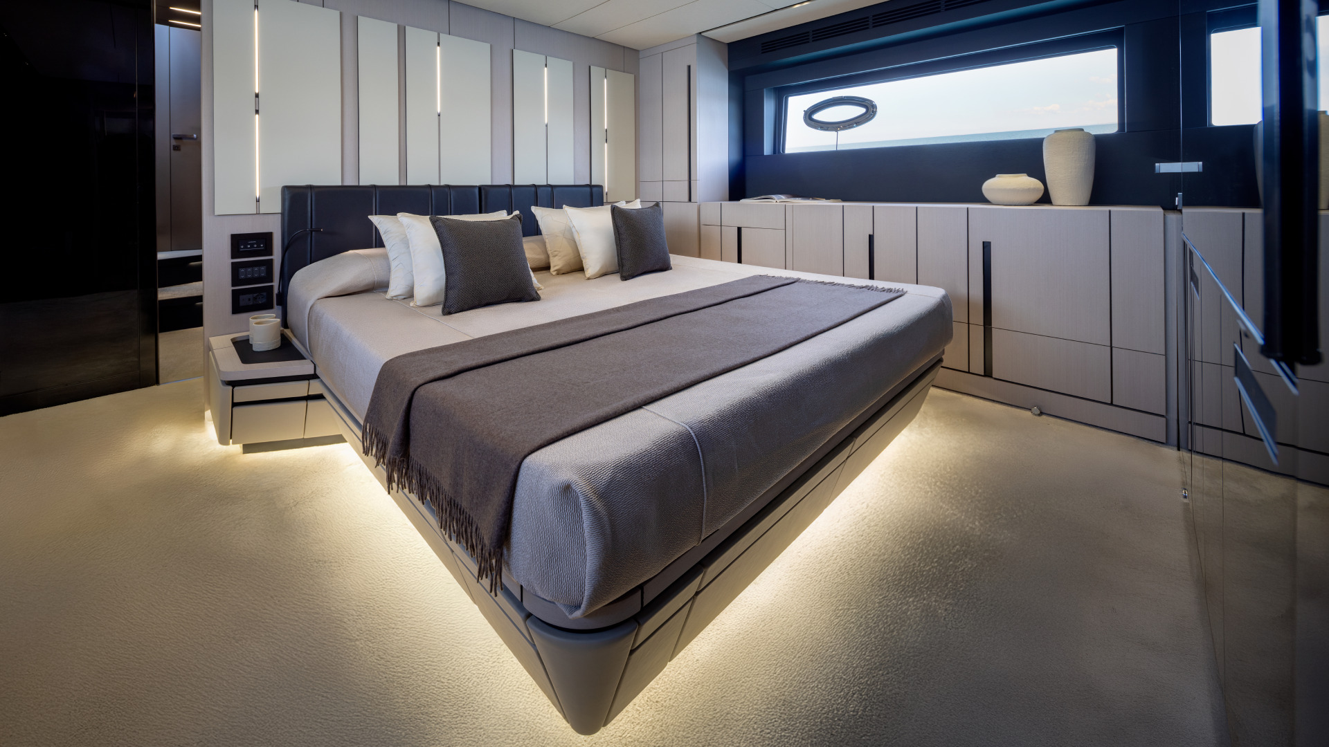Gli interni luminosi valorizzano la zona giorno con cucina open space e salone con doppio divano. La plancia rialzata è progettata per offrire visibilità totale e accesso diretto all’area di prua. Il ponte inferiore ospita la suite armatoriale full beam, una VIP con letto matrimoniale posizionato per massimizzare lo spazio e una cabina ospiti con letti trasversali. L’interior design mantiene l’armonia del main deck, con tagli di luce, superfici specchiate e palette raffinate. Lo sportbridge di 16 metri quadri si articola in tre aree: prendisole, dining e postazione di guida. Qui, comfort e visibilità sono garantiti da una plancia centrale e da una scala di collegamento strategicamente posizionata.