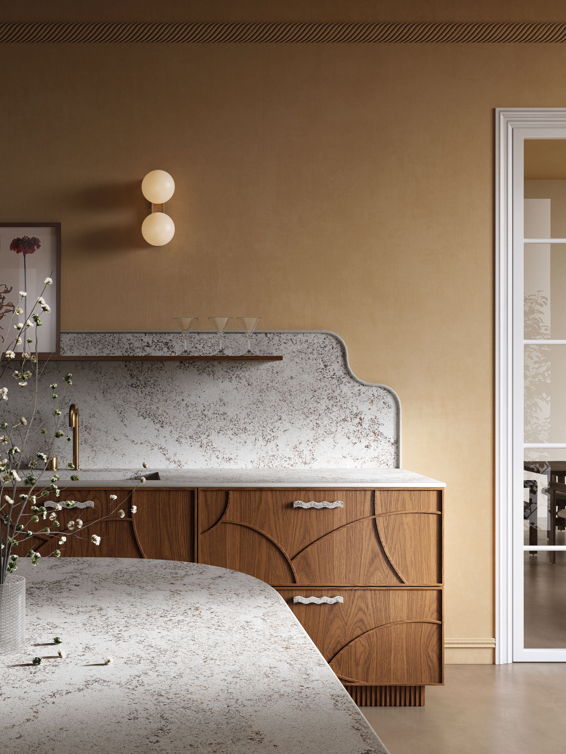 Il motivo decorativo si imprime sulla lastra come accade sulla pietra. Le tracce del tempo diventano parte della composizione e producono una materia visiva fatta di sovrapposizioni e abrasioni. Accanto alla grande lastra compaiono moduli in piccolo formato Acid Majolica, Pearl Glaze, Bronze Metal e Silver Metal. L’insieme costruisce una parete stratificata, in cui la superficie principale dialoga con inserti lucidi e metallici.