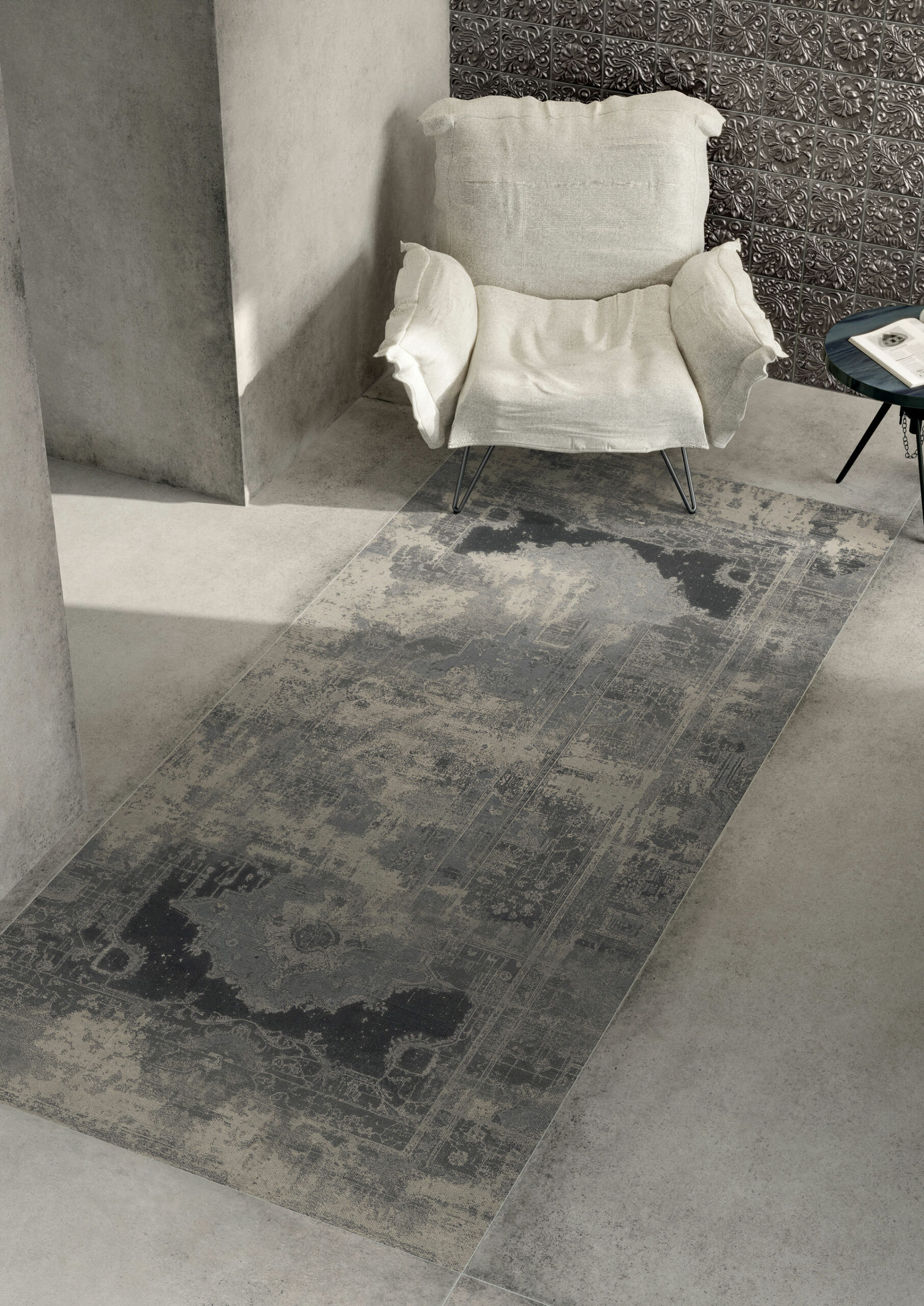 Il secondo colorblock sviluppa una palette più scura. La base resta Distressed Rug, questa volta nella variante Grey. Il disegno mantiene la stessa struttura decorativa ma cambia completamente atmosfera. La superficie si muove tra grigio, grafite e sfumature più fredde. La grande lastra viene accostata a D-Travertino Obsidian, disponibile nelle finiture Natural Lux e Natural, e a D-Rapolano Perla. La composizione alterna superfici ampie e dettagli di piccolo formato, creando un effetto quasi architettonico.