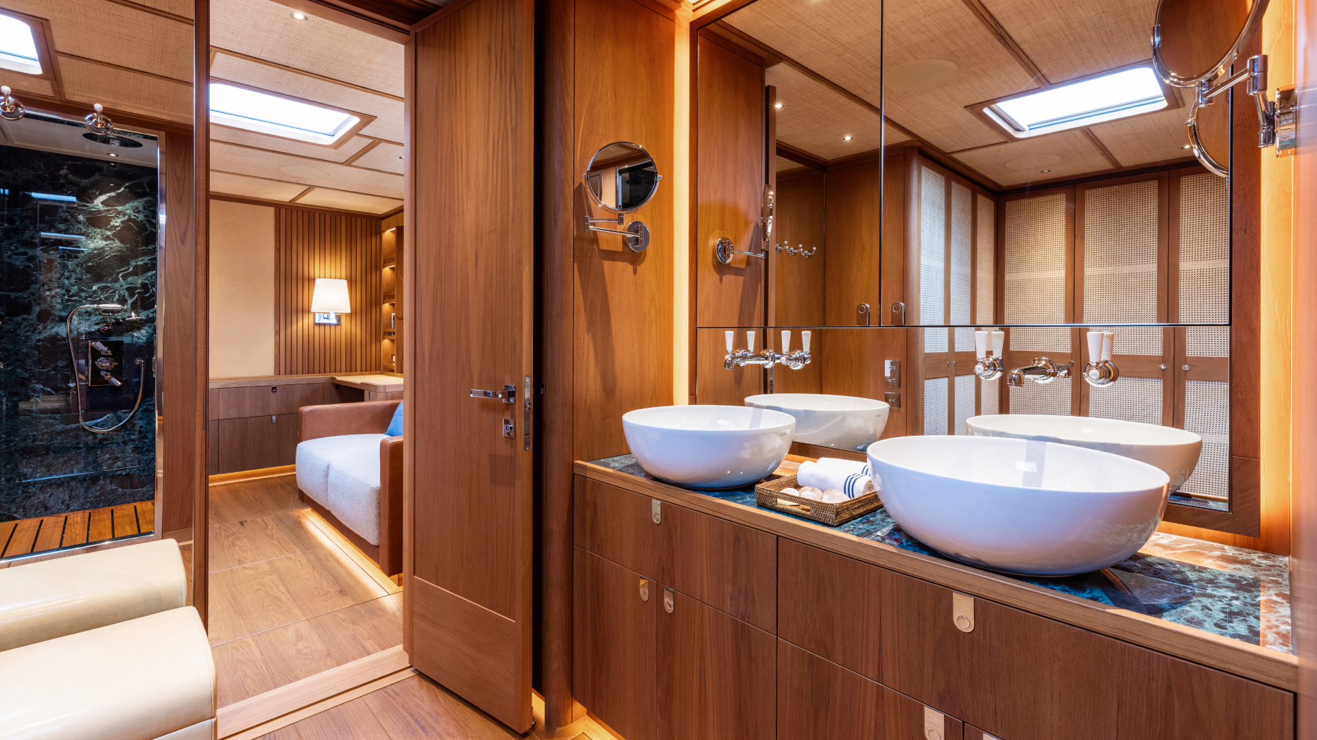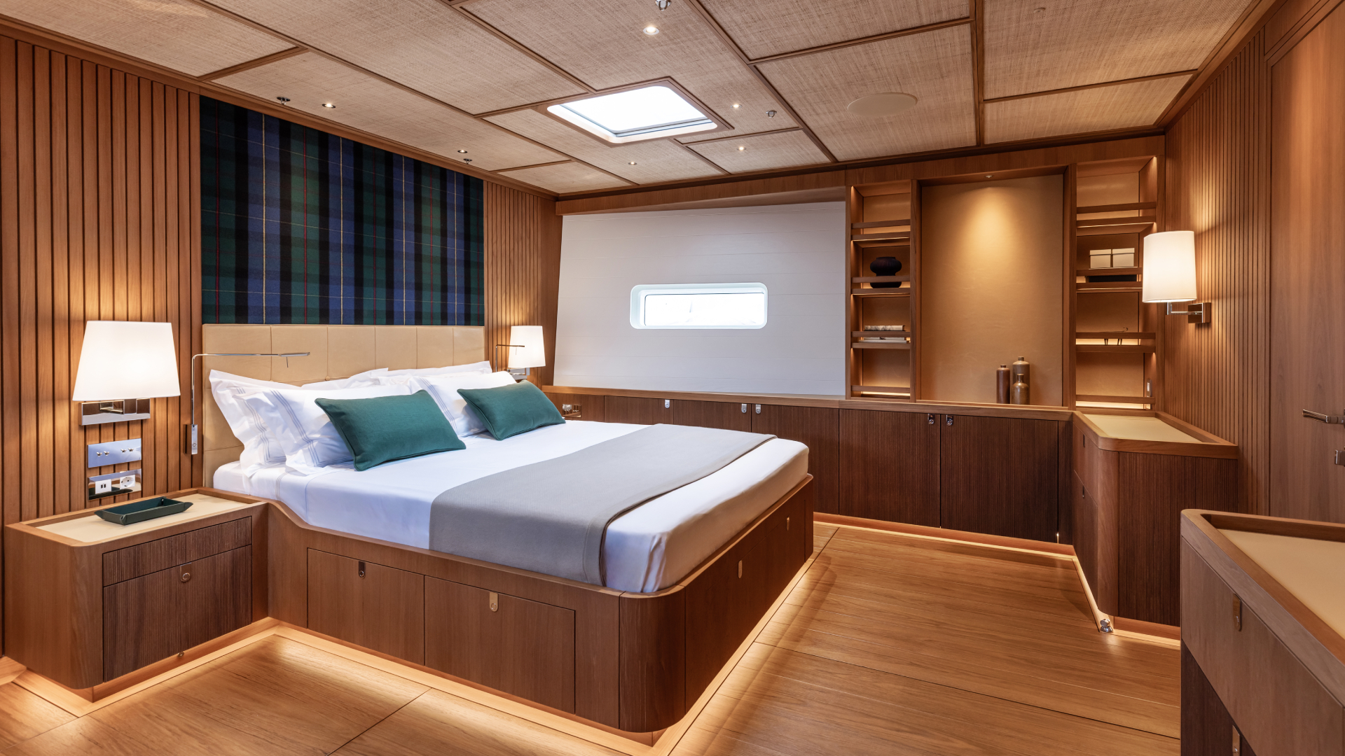 La poppa integra un beach club con garage per tender fino a 4,5 metri e piattaforma bagno, mentre la coperta (firmata Micheletti + Partners) propone linee pulite e funzionali. Il salone semi‑rialzato è illuminato da tre livelli di vetrate, mentre gli interni disegnati da Misa Poggi combinano eleganza e praticità, con layout personalizzabili per rispondere alle esigenze di ogni armatore. Con un’altezza interna considerevole di 2,2 m gli ambienti offrono spazi ariosi e luminosi, mentre la zona equipaggio si distingue per la generosità dei volumi, assicurando il benessere anche per l’equipaggio.